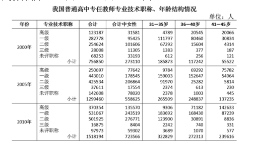 從年齡結(jié)構(gòu)看,2000年、2005年、2010年31-35歲普通高中專任教師總?cè)藬?shù)分別為185873人、265509人、322829人,其中,女性人數(shù)分別為68346人、117838人、164175人;36-40歲普通高中專任教師總?cè)藬?shù)分別為117242人、248837人、272313人,其中,女性人數(shù)分別為35751人、95566人、122953人;41-45歲普通高中專任教師總?cè)藬?shù)分別為55522人、137235人、239616人,其中,女性人數(shù)分別為15728人、42931人、93641人。