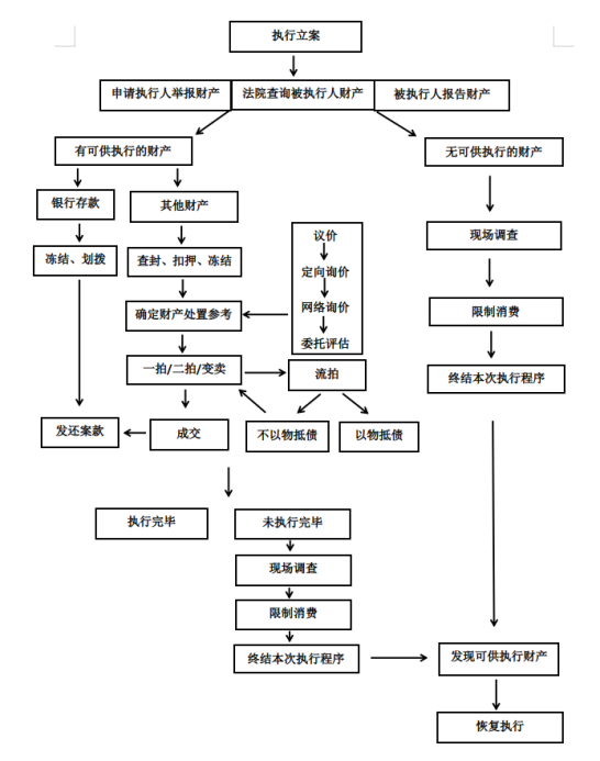 人民法院受理執(zhí)行案件后,會(huì)通知申請(qǐng)執(zhí)行人提供財(cái)產(chǎn)線索,通知被執(zhí)行人報(bào)告財(cái)產(chǎn)狀況,同時(shí)也會(huì)通過執(zhí)行系統(tǒng)查詢被執(zhí)行人名下的財(cái)產(chǎn)。如果發(fā)現(xiàn)可供執(zhí)行的財(cái)產(chǎn),法院會(huì)根據(jù)財(cái)產(chǎn)類型的不同采取相應(yīng)的執(zhí)行措施。銀行存款可進(jìn)行凍結(jié)、劃撥。其他類型的財(cái)產(chǎn)查封(扣押或凍結(jié))后,一般需要先確定財(cái)產(chǎn)處置參考價(jià),然后通過司法拍賣進(jìn)行變價(jià)。如果未發(fā)現(xiàn)可供執(zhí)行的財(cái)產(chǎn),法院通常會(huì)到被執(zhí)行人的住所地進(jìn)行現(xiàn)場(chǎng)調(diào)查、對(duì)被執(zhí)行人進(jìn)行限制消費(fèi),然后終結(jié)本次執(zhí)行程序,以后若發(fā)現(xiàn)可供執(zhí)行的財(cái)產(chǎn)可以恢復(fù)執(zhí)行。(附流程圖)