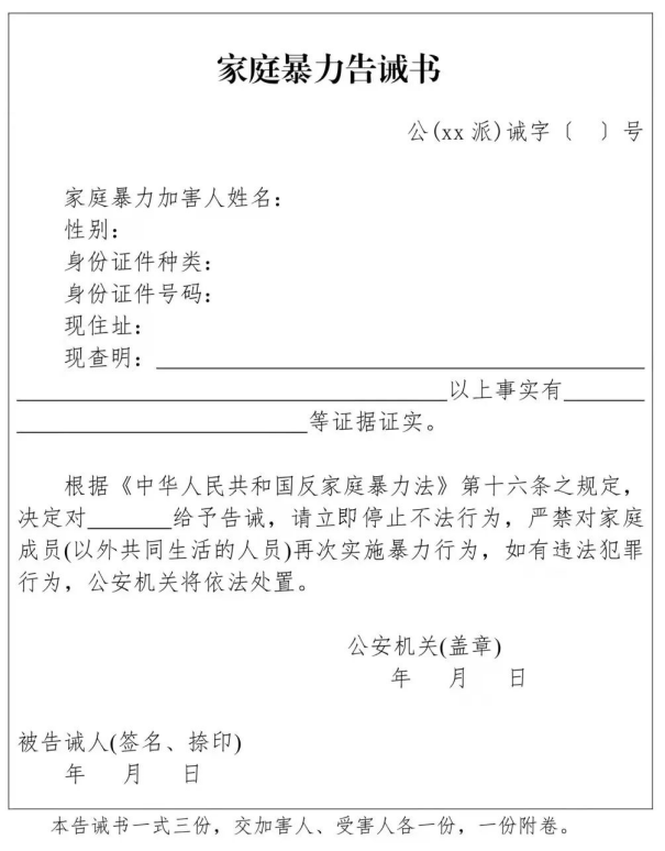 《家庭暴力告誡書》一式四份:一份由加害人簽名、捺指印后存檔,一份交加害人,一份交受害人,一份抄送案發(fā)地居(村)民委員會。