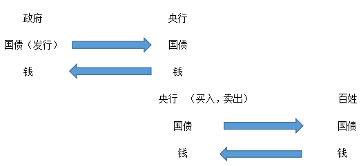 通過這張圖示大家可以看出來,當政府和央行之間流通國債是屬于財政政策的,當政府發(fā)行國債后,并不是直接和百姓進行交易,是賣給央行,政府拿到錢之后會用于彌補財政赤字,基礎設施建設,所以這個時候市場當中的貨幣供應量會增加。當央行賣出國債的時候會把國債賣個百姓,百姓把錢給央行,會導致市場中的貨幣供應量減少。