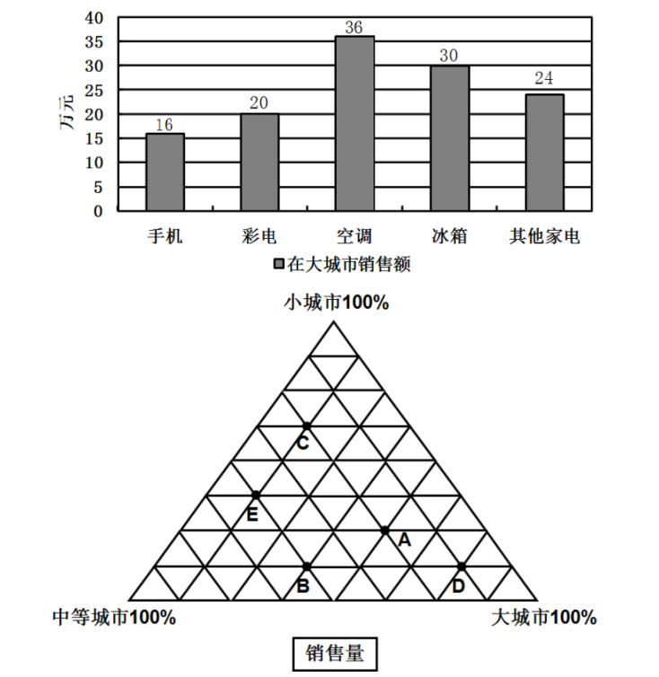69.彩電和冰箱在各類城市的銷售總額相差:( )。