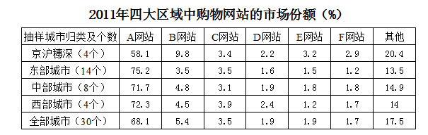 119.2011年上述表格所列的購(gòu)物網(wǎng)站中,有2個(gè)以上區(qū)域市場(chǎng)化比其抽樣市場(chǎng)平均份額高1個(gè)百分點(diǎn)的是:( )
