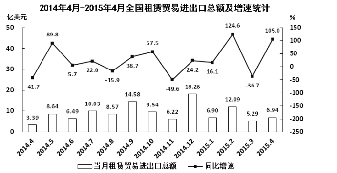 A、2015年4月全國租賃貿(mào)易進出口額比2013年4月翻了一番
