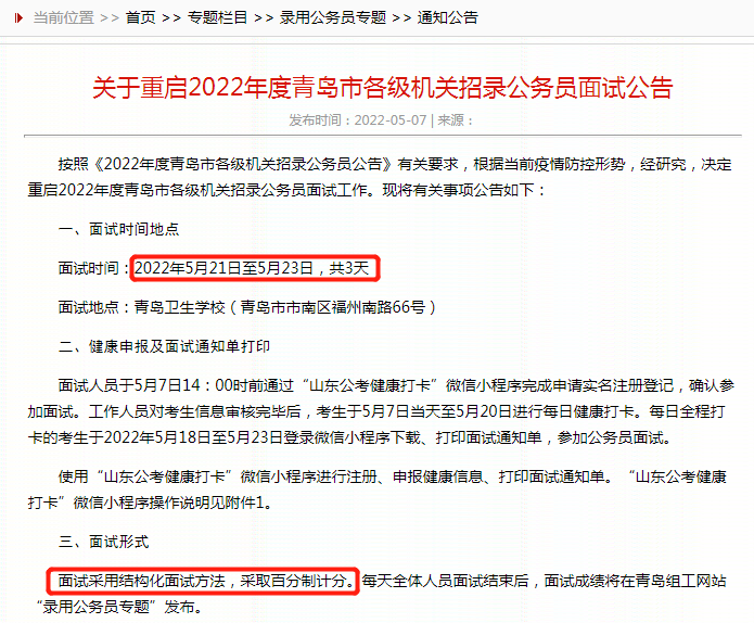 確定啦!確定啦!2022年青島公務(wù)員面試重啟時(shí)間確定:2022年5月21日至5月23日,共3天