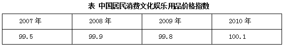 問題①:2010年中國居民消費(fèi)文化娛樂用品價(jià)格比2009年高。(判斷正誤)