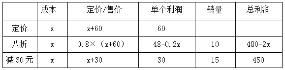 例1:某商品按定價出售,每個可獲得60元的利潤。按定價打八折出售10個所獲得的利潤,與按定價每個減價30元出售15個所獲得的利潤相同。該商品的定價為多少元( )?