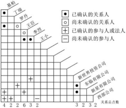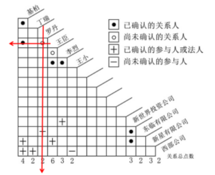 第二,找兩主體之間的關(guān)聯(lián)關(guān)系。以找羅丹和王臣的是否存在關(guān)聯(lián)為例,先找到羅丹所在列,往下做垂線,找到王臣所在行,橫向做水平線,兩者相交的單元為兩者之間的關(guān)系,即