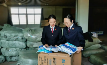 南昌高新區(qū)檢察院辦案檢察官實(shí)地查看涉案醫(yī)用防護(hù)服及包裝箱等物證。