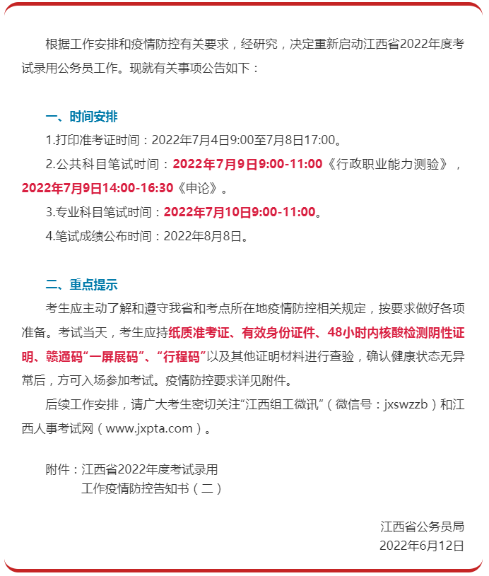 最新消息!2022年江西公務員考試筆試時間公布:7月9-10日舉行!官方通知如下: