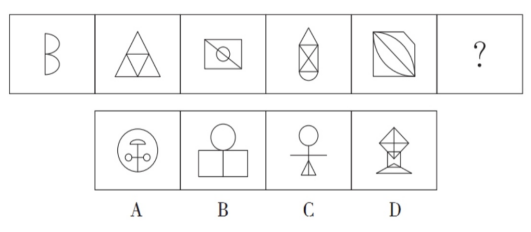 【答案】B【解析】這組圖形從整體外觀來看相似性也是很低的,此時(shí)咱們從對(duì)稱性、封閉開放性上面沒有找到規(guī)律,但可以看到每一個(gè)圖形都由直線和曲線構(gòu)成,可以考慮直線和曲線上的關(guān)系,觀察發(fā)現(xiàn),圖形當(dāng)中直曲交點(diǎn)數(shù)分別為2、3、4、5、(6)。故選B。