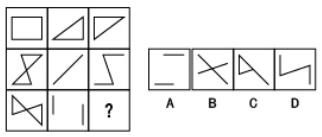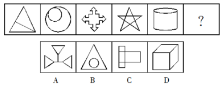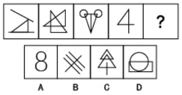【答案】D【解析】這一組圖形從整體外觀上來看,相似性是很低的,此時(shí)咱們優(yōu)先考慮這組圖形自身的幾何特點(diǎn)是否具有規(guī)律,觀察發(fā)現(xiàn),這一組圖形都具有對(duì)稱性,此時(shí)選項(xiàng)中A、D具有對(duì)稱性,繼續(xù)觀察,整組圖形的對(duì)稱軸方向是縱橫交替出現(xiàn),故最后選擇一個(gè)對(duì)稱軸是橫向的,選擇D。