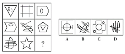 【答案】A【解析】觀察題干圖像相似度低且不規(guī)則,考慮數(shù)量關(guān)系,按照口訣先面后線,在一筆畫的順序,發(fā)現(xiàn)都不成規(guī)律,接著數(shù)點(diǎn),發(fā)現(xiàn)每一行所有點(diǎn)的數(shù)量為:第一行3,4,5,第二行6,7,8,第三行前兩個(gè)9,10,按照此順序問號(hào)處交點(diǎn)數(shù)應(yīng)為11,觀察選項(xiàng)只有A項(xiàng)的交點(diǎn)為11個(gè),正確答案是A。
