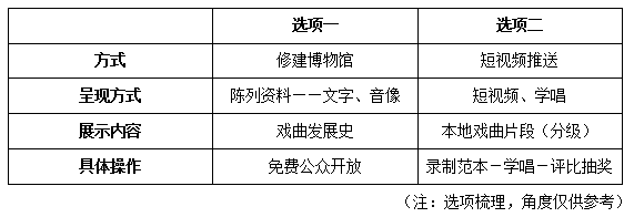 圍繞選項一與選項二進(jìn)行對比,可發(fā)現(xiàn)選項一滿足:覆蓋面廣、群眾參與免費成本低等優(yōu)點,而博物館的展覽在參觀、體驗的門檻上要求相對較高,需要一定的戲曲基本知識;修建博物館成本更高;傳播集中于本地居民,而后逐步外移。