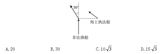 例3:一艘非法漁船作業(yè)時發(fā)現(xiàn)其正右方有海上執(zhí)行船,于是沿下圖所示方向左轉(zhuǎn)30度后立即以15節(jié)(1節(jié)=1海里/時)的速度逃跑,同時執(zhí)法船沿某一方直線方向勻速追趕,并正好在某一點追上。已知漁船在被追上時逃跑的距離剛好與其發(fā)現(xiàn)執(zhí)法船時與執(zhí)法船的距離相同,則執(zhí)法船的速度為多少節(jié)( )?