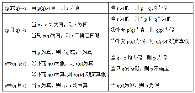 通過這道題,我們發(fā)現(xiàn)綜合推理中如遇假言命題的前件或后件為聯(lián)言命題或選言命題,需要綜合運用這三類命題的推理規(guī)則。下表總結(jié)了綜合推理中可能出現(xiàn)的前件或后件為聯(lián)言命題或選言命題的四種假言命題的情況,以及相應的推理規(guī)則,同學們要牢記并且多加練習,才能撥開重重迷霧,提高正確率。