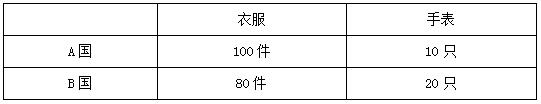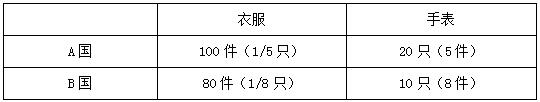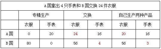 表1中A國和B國一天單獨制作衣服和手表的數(shù)量,從這張表格里我們不難看出A國的絕對優(yōu)勢產(chǎn)品是衣服,B國是手表,他們就可以采用只生產(chǎn)自己具有絕對優(yōu)勢的產(chǎn)品,再通過貿(mào)易的形式互相交換另一樣所需產(chǎn)品。