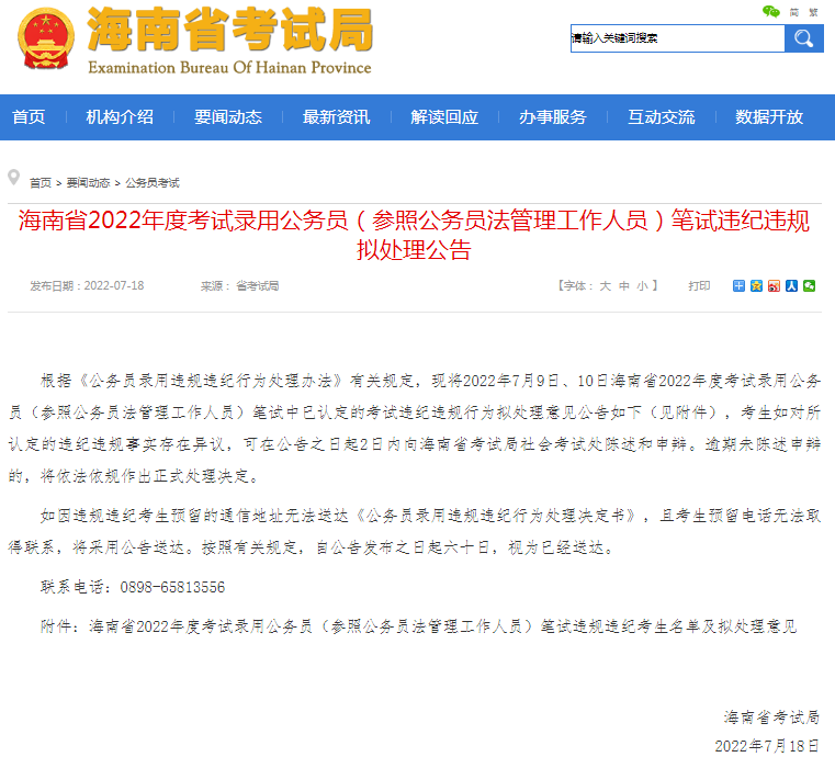 公告顯示,按《公務(wù)員錄用違規(guī)違紀(jì)行為處理辦法》有關(guān)規(guī)定,將2022年7月9日、10日海南省2022年度考試錄用公務(wù)員(參照公務(wù)員法管理工作人員)筆試中已認(rèn)定的考試違紀(jì)違規(guī)行為擬對(duì)相關(guān)考生作出相應(yīng)科目(場(chǎng)次)考試成績(jī)?yōu)榱愕奶幚怼?/p>
