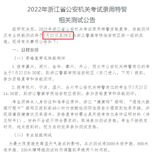 報考2022年浙江省考特警崗位的考生注意,官方已經(jīng)發(fā)布《2022年浙江省公安機關(guān)考試錄用特警相關(guān)測試公告》,資格復(fù)審、體能測評及專業(yè)技能測試將于7月27日-29日進行。如下: