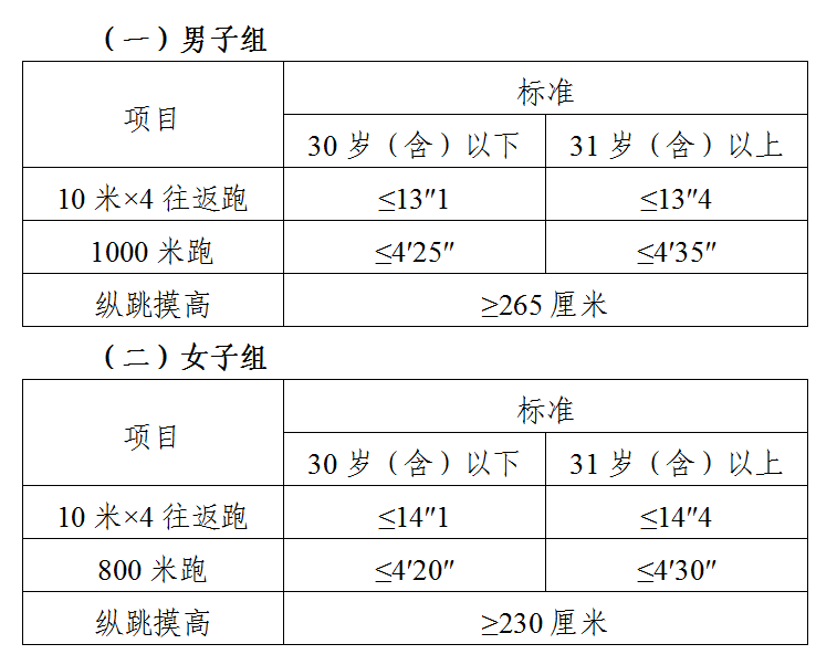 體能測評三項全部達標(biāo)方為合格。報考緊缺職位的人員,體能測評項目3項中有2項達標(biāo)的,視為合格。體能測評項目中,縱跳摸高的測試次數(shù)不超過3次(當(dāng)場),10米×4往返跑的測試次數(shù)不超過2次(當(dāng)場),男子1000米跑和女子800米跑項目的測試次數(shù)均為1次。